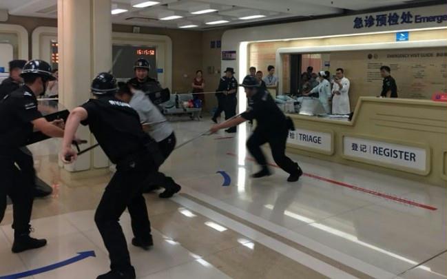 演练中,一患者因对浙医二院急诊过程产生不满,要求退费,与现场护士争吵,情绪激动,掏出随身携带武器威胁现场医务工作人员,导诊台护士立即按下报警按钮,通知保安,同时电话告知保卫科,保卫科接到报警后马上启动医院222应急预案。特保班长刘海军接到命令后,立即带领3名队员配置钢叉、警棍、盾牌等到达现场后,迅速建立警戒范围,将其合围。驻点保安队长付名祥带领4名队员对围观群众及时进行疏散。并开展现场工作,控制、维护现场局面和秩序,并根据现场情况采取有效的措施后将其制服并带离现场交公安机关处置。