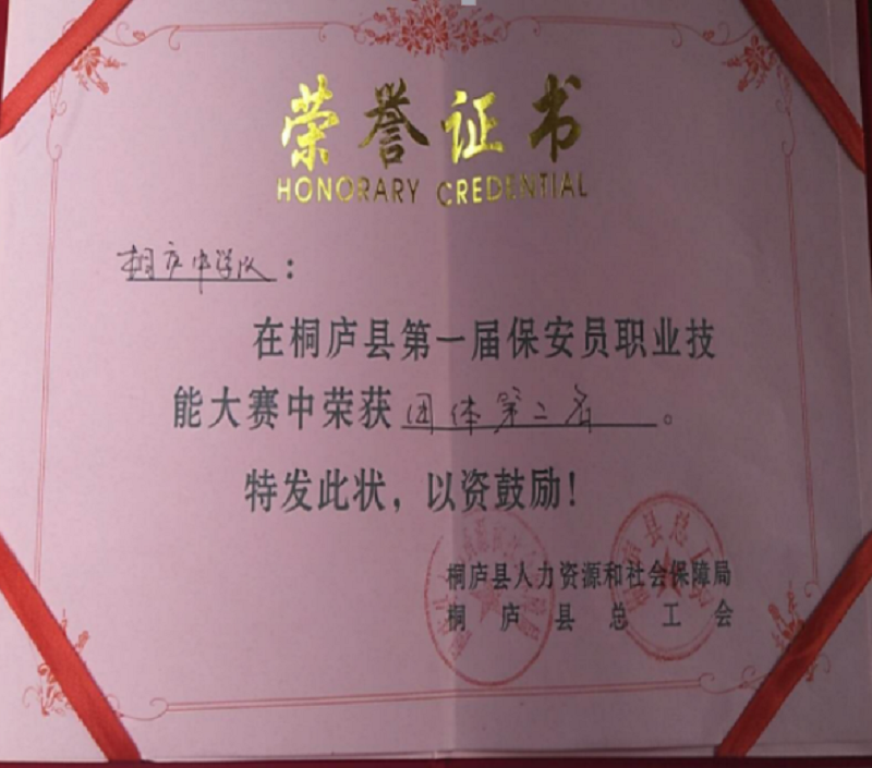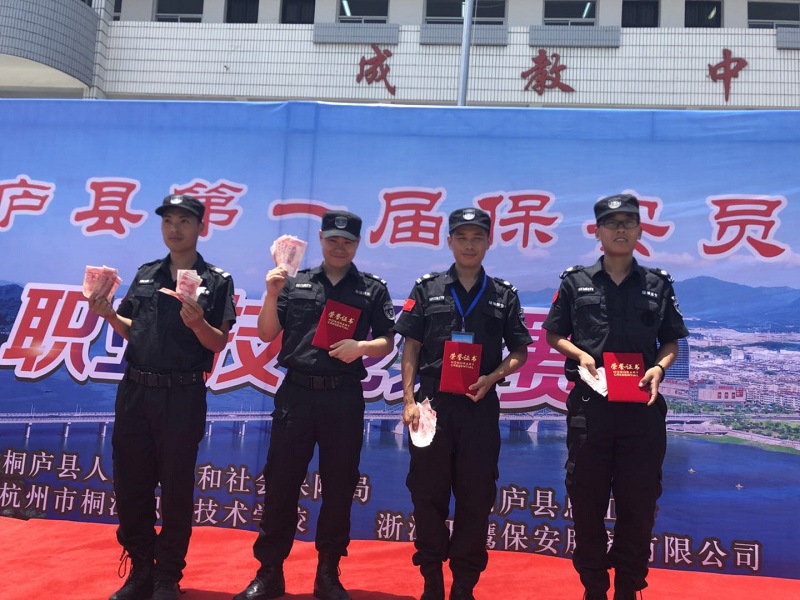 2018年6月29日,浙江绿城保安服务有限公司桐庐保安队在“桐庐县第一届保安员职业技能比赛”中获佳绩。分别包揽了个人单项和全能前三名以及团体第二名的优异成绩(获得奖金4300元)。
