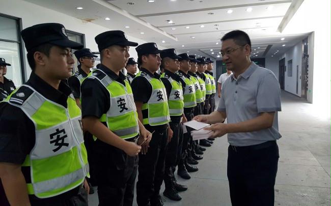 2018年7月25日上午,市直机关党委工会赵东升书记一行人在市机关事务管理局保卫处处长陈可的陪同下,来到杭州市安保服务集团有限公司驻市民中心特勤大队,向克服酷热天气、坚守工作岗位,为市民中心行政区维护安全稳定的队员表示诚挚敬意和深切问候,并给在场的队员送上慰问品。 赵书记强调,市民中心特勤大队对维持市民中心行政区正常的办公秩序,起着至关重要的作用,对市民中心行政区的稳定运行,功不可没。同时要求大队管理人员在夏季高温期间,要加强做好防暑降温工作,确保队员身体健康安全。