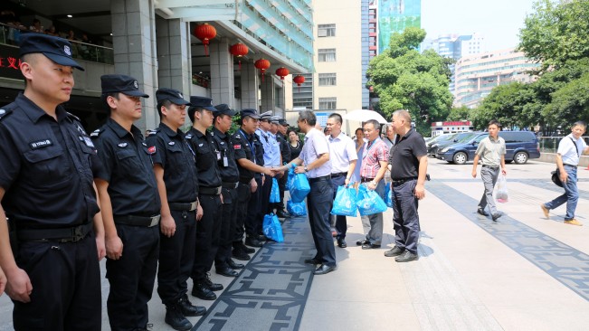 7月以来,我市天气持续高温,骄阳似火,热浪滚滚,公司一线执勤人员辛苦工作,战高温斗酷暑。市总工会副主席张坚申向在酷暑中坚守岗位的一线保安员们表达了敬意和关怀,同时询问了他们的生活情况,他关切地说到:“各位同志在辛劳执勤的同时要多注意休息,大家辛苦了!”公司总经理郑雪林叮嘱大家要注意自我调节,防止高温中暑,同时希望保安员们克服困难、坚守岗位。