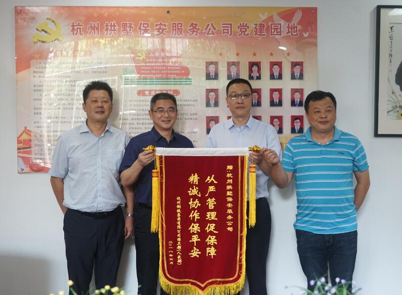 8月1日下午,杭州拱墅保安服务公司收到了一面来自杭州钢铁集团有限公司保卫部的锦旗和一封感谢信。