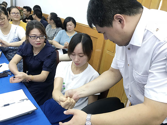 课堂上,周老师向大家耐心示范心肺复苏模、人工呼吸及胸外心脏按压的正确操作方式。周老师强调,一个人最重要的是健康,并向大家介绍了我国10大致命疾病。同时,还详细介绍慢性疾病的临床症状和护理、高血压发病机理、脑血管爆裂、脑中风等疾病。最后,周老师还向大家介绍了健康家庭必备三计:体温计、体重计和血压计,并现场为参与学员量了血压。不仅如此,安老师还通过一些简单的姿势,穴位帮助大家理解现代职业病(肩周炎、颈椎病、腰肌劳损、静脉曲张等),提醒大家在紧张的工作中也不要忽视自身的健康。