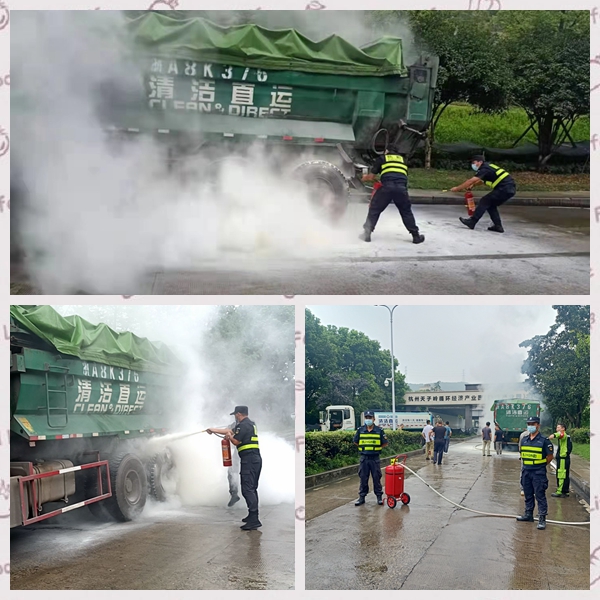 事发于2021年8月11日下午15:30分左右,正在杭州环境集团北区门岗执勤的李波同志发现一辆清运车轮胎起火,李波同志第一反应打停车手势让司机靠边停车,司机师傅得到他的信息后,迅速反应后减速,并以最快的速度将车辆靠边停稳。李波立马呼叫当班另一位同事秦荣宝,两人随即拿来灭火器冲向着火的清运车灭火。此时,岗亭内的王洪伟同志也发现这一突发紧急情况,第一时间把情况上报客户单位负责人及指挥中心,并迅速叫救援。洒水车及时赶到着火现场,现场灭火工作紧张有序开展。