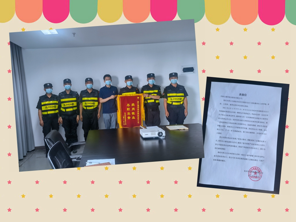 客户单位负责人说:“在发现了突发火情后,几位同志果断采取了正确的处置方式,使用灭火器迅速将火扑灭,确保了我司的财产没有受到太大的损失。贵公司能培养出这样爱岗敬业,将客户利益放在首位的员工,我们为你们感到骄傲!”