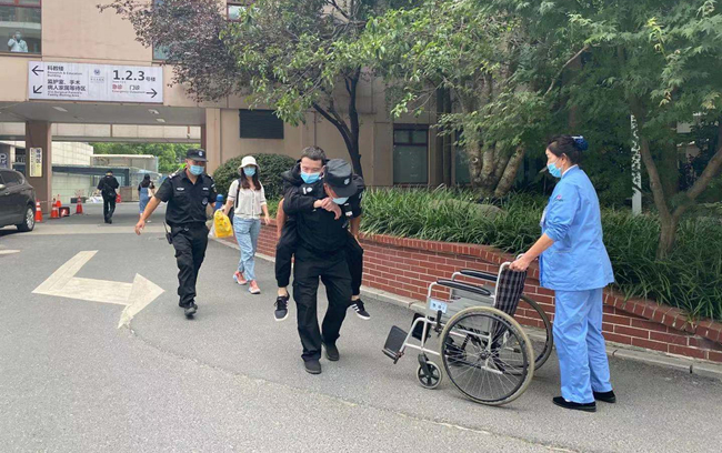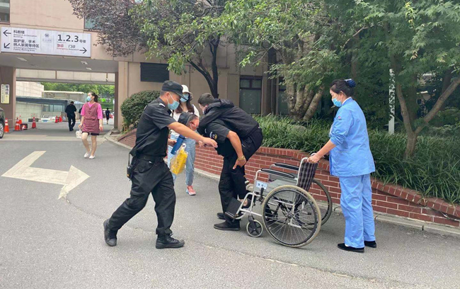 那天正在巡逻执勤的保安员姚水荣发现一名独自往门诊大楼方向走的男子步履蹒跚,出于职业习惯,他一眼就看出可能是一位正在犯病的患者,于是他立即追住男子,此时患者已满脸痛苦模样,虚汗直冒。看到这个情况,姚水荣赶紧扶住患者,边向值班班长汇报,申请调度轮椅,支援的保安员很快就将轮椅送到,但是此时患者似乎病痛加剧,坐在轮椅都坐不稳,顺着轮椅就滑了下来,为怕病情影响持续扩大,姚水荣二话不说,果断蹲下背起患者向急诊大楼跑去。
