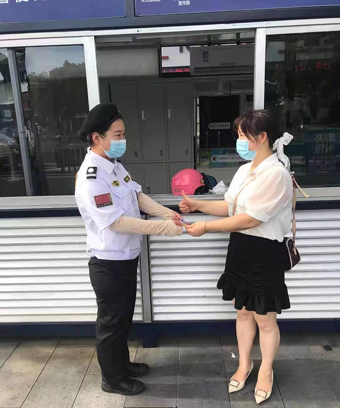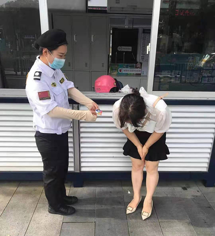 这位年轻的妈妈一边竖着大拇指一边感动地说:“我儿子就在附近的中学上学,这些年,每天我接送他上学放学的时候,总是看见你们恭恭敬敬等候在校园门口,一边欢迎着孩子们进校门一边维持着校门口的秩序,无论冬夏,风雨无阻,已经坚持这么多年了,我真心感谢你们的付出。你们真的是用心在为我们办实事!一直以来对你们的好感放在心里,今天又遇到我儿子的证件也被你们找到,刚好有机会,让我忍不住,就想用一个深深的鞠躬来表达对你们的敬意和谢意。”