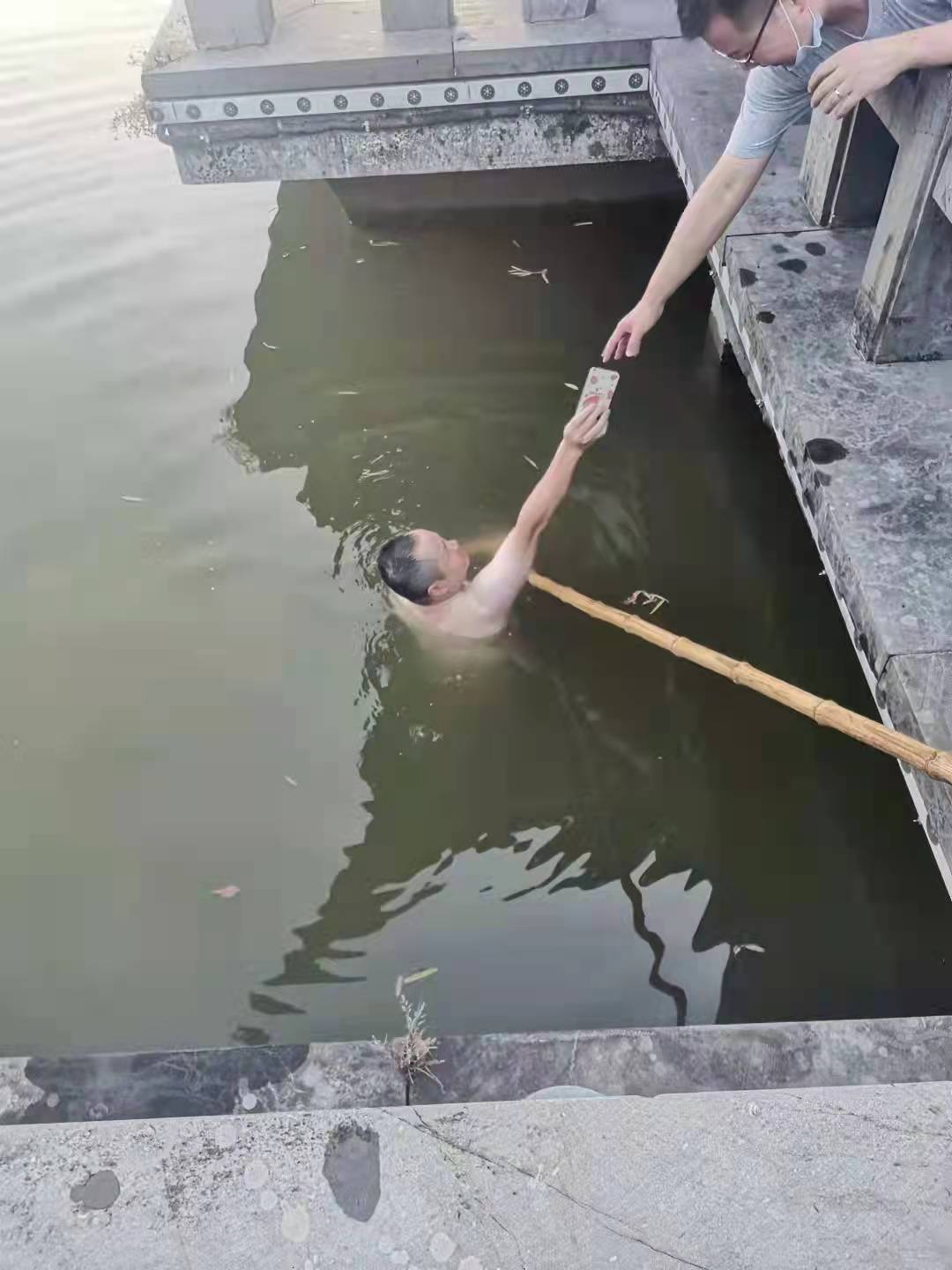 “我手机掉进水里啦!帮帮忙啊!谁来帮帮忙!”东吴公园的湖边,传来求助声。正在执勤的杭州富阳保安公司保安员钟占一正在附近巡逻,听到呼喊声立刻赶往湖边。