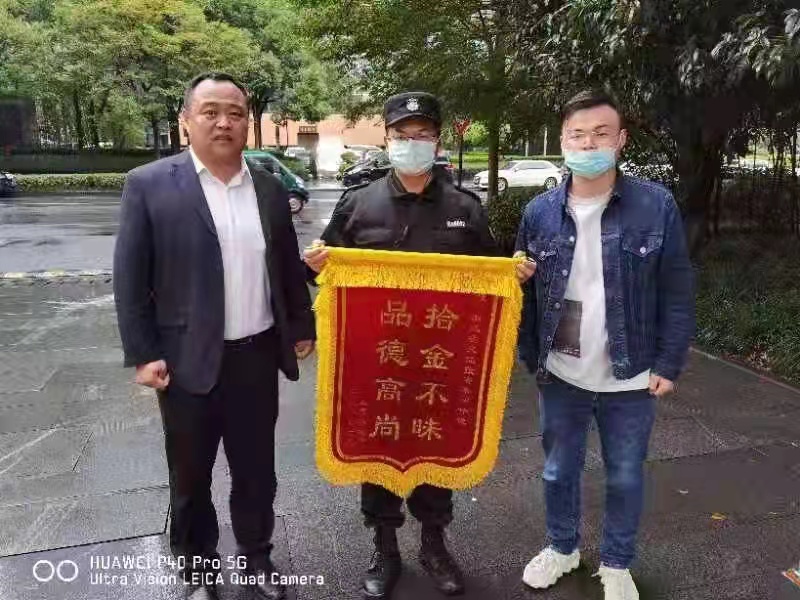 10月14日下午16时,浙江绿城保安服务有限公司明珠国际保安队保安员叶俊在23号楼例行巡逻过程中,发现对面瑞晶国际大楼有辆崭新的电瓶车车灯未关,周围也并未发现有人在现场,随即判断车主可能没有拔钥匙。下岗之后叶俊发现对面电瓶车上还是插着钥匙,叶俊心想车主一定很着急,因为其他很多钥匙也在这上面。于是第二天他马上联系了车牌上的经销商,问是否有该车主的信息,最后从经销商处得知只有从交警大队可以获取车主信息,最后联系了江干区交警大队,在15号中午12点将钥匙交还给了车主,车主连连道谢。为失而复得让车主欣喜不已,车主高度赞扬并感谢保安员叶俊拾金不昧、品德高尚的行为,为他的忠诚履职,细致负责点赞,并亲自为他送来了一面感谢锦旗。