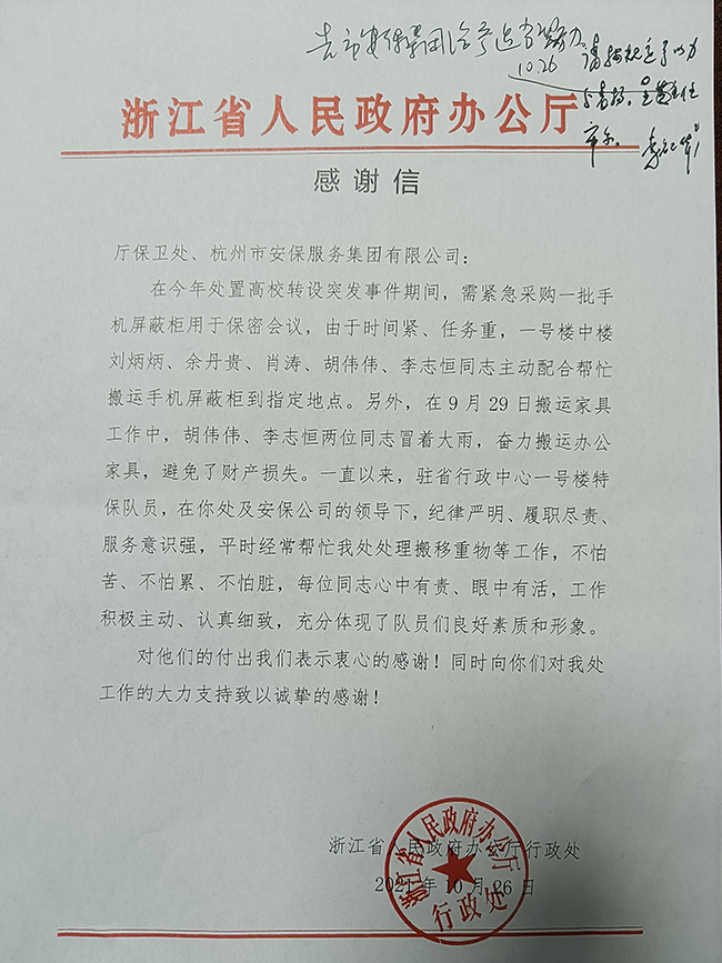 10月26日,杭州市安保集团驻省府特保中队警卫组收到驻点相关部门感谢信,对该班组工作表示肯定和赞扬,对执勤队员的积极主动服务、提供帮助及相关保障致以诚挚的感谢。