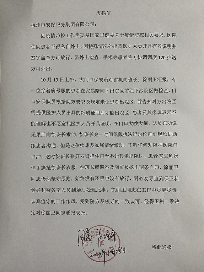 近日,杭州市安保集团某驻点安保中队收到客户单位表扬信,信中对驻点安保班长徐丽卫同志在工作中认真负责,尽职尽责,面对突发事件妥善处理,坚守院方规定,坚持文明执勤、柔性劝导的工作作风提出通报表扬。