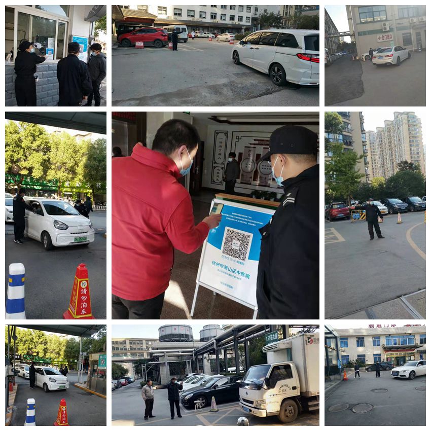 驻萧山区中医院保安员们认真执勤,严把医院大门关,严格检查健康码行程码,指挥车辆有序停放,确保医患安全。
