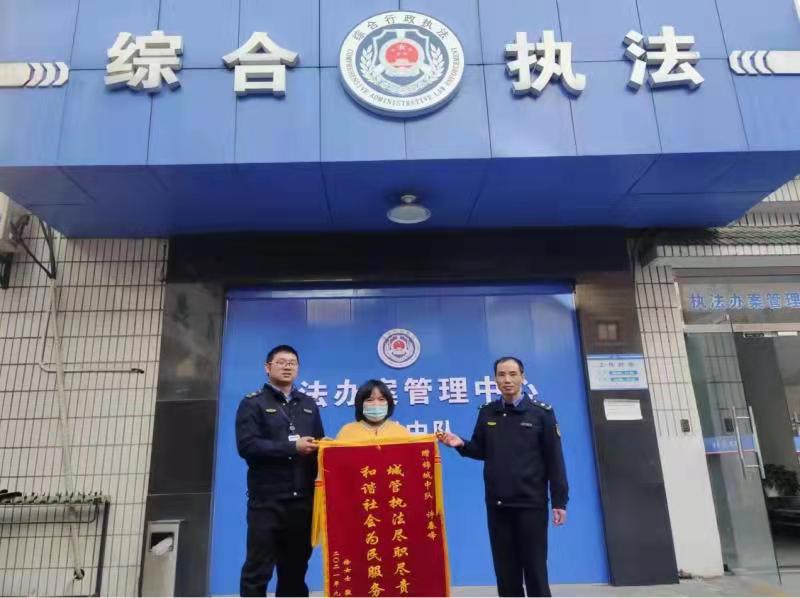 11月17日,杭州临安的徐女士将一面“城管执法尽职尽责,和谐社会为民服务”锦旗送到浙江神盾保安服务有限公司驻浙江省杭州市临安区城管锦城中队保序员许春峰同志手上,对许春峰同志尽职尽责为民服务的精神高度赞许并表示诚挚感谢。