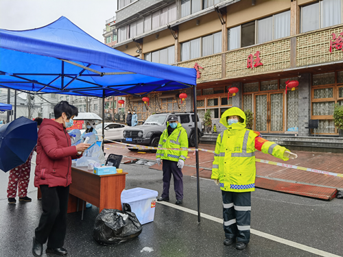 早上6:20,冬日的富阳天还未亮,参与疫情防控的富阳保安人已分别在5个核酸检测点集合到位,助力金桥社区抗疫。健康码查验、分发棉签、秩序维护......各核酸采样点检测正式开始后,志愿者们按要求开展工作,确保现场井然有序。期间,部分志愿者参加核酸样本运送,单人最高运送量达2710份。新的检测点确定后,志愿者主动加入帐篷搭建队伍,力求尽快完成现场布置。近两日,富阳早晨的温度跌至零下,还下起了细雨,志愿者们冷得直打哆嗦,手脚冻得通红,“冷是冷,但能为疫情防控献一份力,心是暖的”,“只希望疫情能早日过去,富阳能重新恢复正常秩序,辛苦一点不算什么”,每天需经过近5个小时的奋战,志愿者们才能完成检测点的工作。