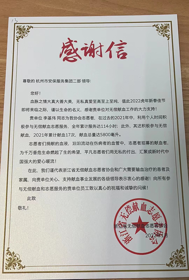 近日,杭州市安保集团保安二部收到浙江省无偿献血志愿者协会发来的一封诚挚的感谢信。信中,协会对公司保安员李基伟热心公益事业的爱心之举给予了充分的肯定和高度的评价。