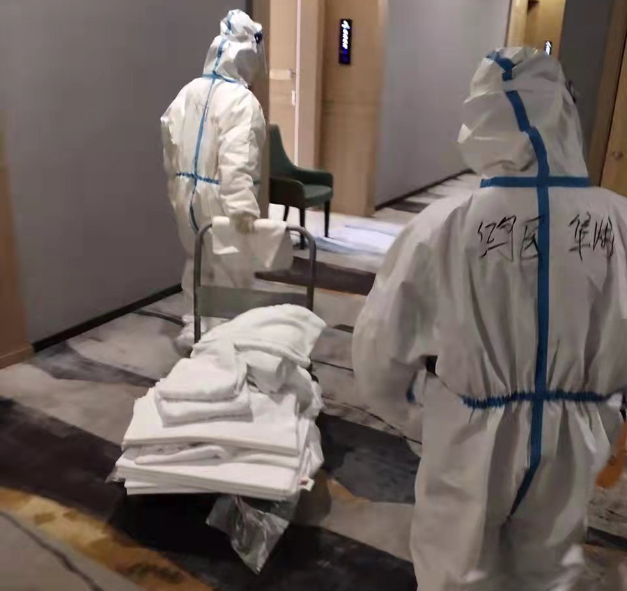 别看22岁的她年龄不大,保安服务经验却十分老道。只见她和队员同事们一起,又是送布草,又是换枕芯,宛如熟练的酒店客房服务员。一个保安员,把酒店客房服务工作做得这么细致到位,令酒店的隔离客人刮目相看,纷纷留言赞誉这位个子小小却有大能量的保安队员王宝宝同志。