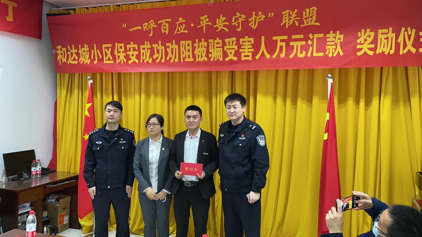 3月4日上午,闻潮派出所所长杜海涛带领副所长钱杭斌、社区民警叶磊联合社区,对李龙进行表彰和颁奖。在表彰会上,杜海涛对李龙的表现予以肯定和赞扬,同时普及了目前新增的诈骗手段以及相应的防范措施。通过本次对优秀反诈宣传志愿者的表彰,大大鼓舞反诈志愿者队伍的士气,增强了反诈志愿者队伍的凝聚力,也带动了更多热心群众加入到反诈志愿者队伍当中。