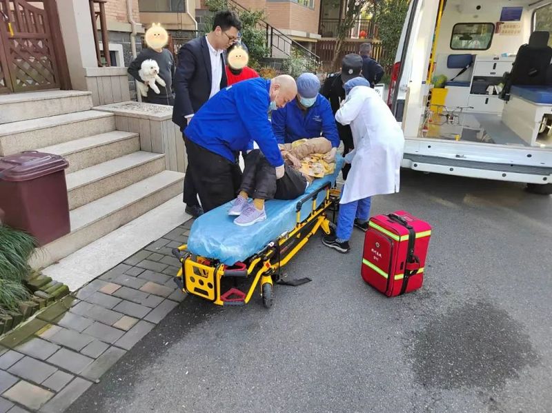 与此同时,保姆联系到了老人家属,但家属均在外工作,短时间无法赶回家里,拜托我们保安人员帮忙。丁松和项目主管安抚好家属情绪后,立刻抱住长者,并时刻关注他的脉搏和呼吸情况,随后陪同120护送人员前往医院与业主家人汇合。