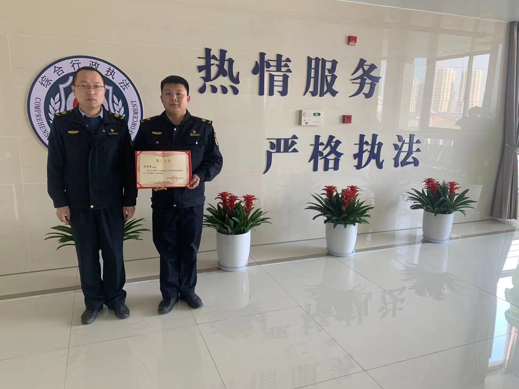 2022年03月14日上午10点,杭州市临平区星桥街道城管中队领导推选陈佳宝同志为2021年度临平区十佳城管执法辅助人员并亲自为陈佳宝同志颁发此证,此荣誉由杭州市临平区综合行政执法局颁布,相关领导充分表达了对陈佳宝同志在2021工作的认可,特发此证,以资鼓励。星桥街道项目基地负责人陈佳宝在过去的一年里,担任星桥项目队长以来,在工作中一直勤勤恳恳、兢兢业业,无论是配合甲方领导整治还是扣摊贩过程中,一直奋斗在第一线,对于领导交代的任务,完成的都相当出色,感谢星桥城管中队领导对陈佳宝同志的厚爱和对他工作成绩极大的认可。新的一年,新的气象。