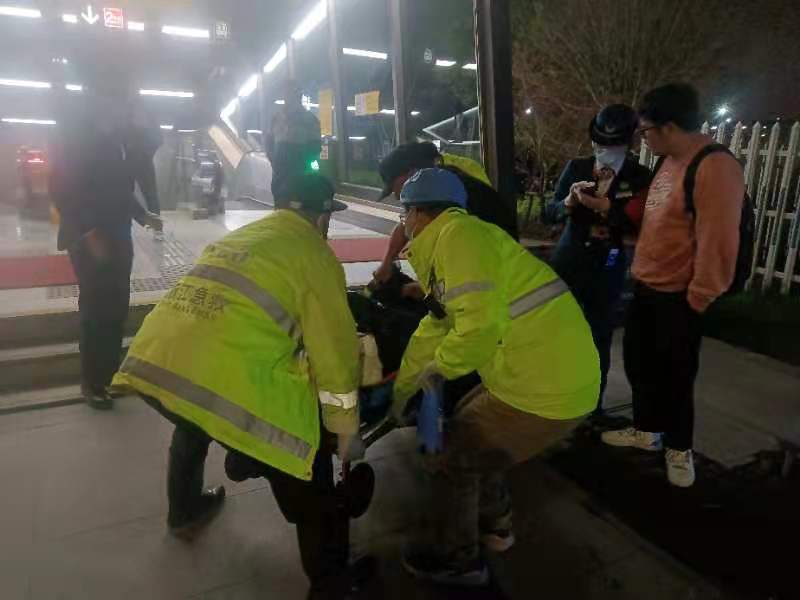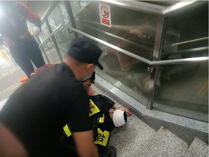 2022年3月21日晚21:20分左右,浙江民泰驻杭州市余杭区良渚地铁菜场项目队员王艳强、郑之元巡逻至地铁二号线良渚站D出入口时,发现步行楼梯上有一男子一动不动的趴在地上,头部流血受伤严重。