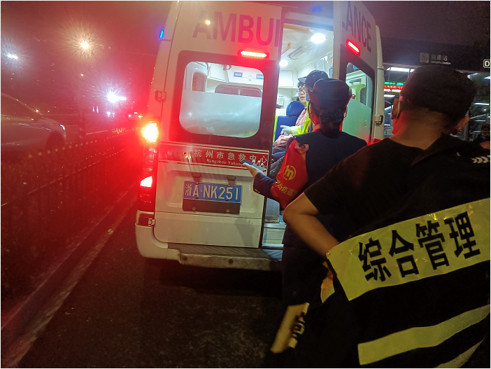随后120到达现场,队员协助急救人员将伤者抬上单架,看着远去的救护车才安心回到岗位继续巡查。