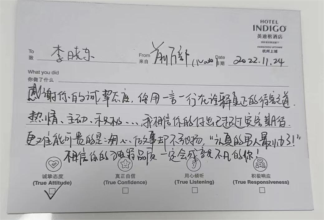 11月24日,萧杰保安驻英迪格酒店项目保安李晓东收到客户单位一封感谢信,对他热情主动、认真诚恳的工作态度予以肯定和表扬。