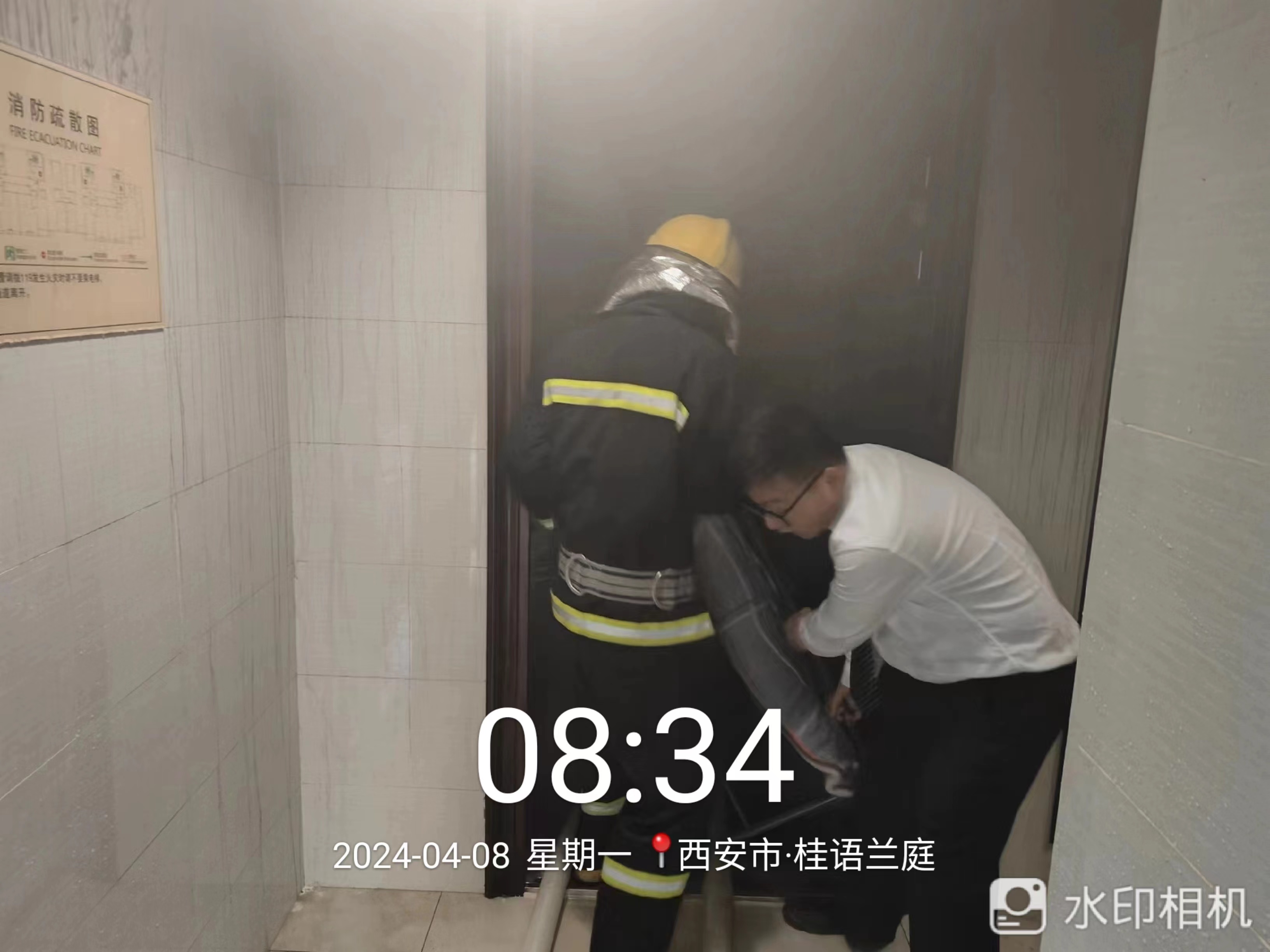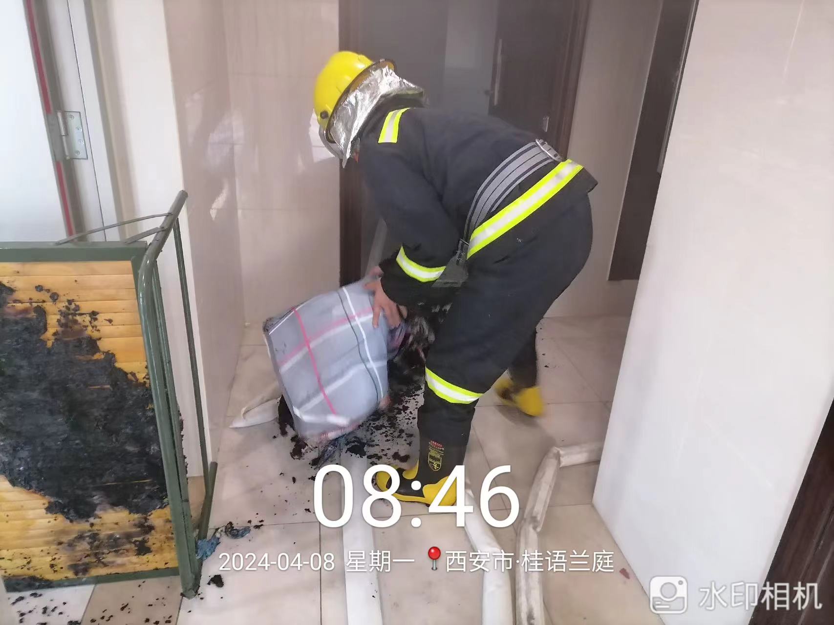 2024年4月8日8:30,桂语蘭庭监控室收到业主户内火灾烟感报警,项目经理、安全经理第一时间启动火灾应急预案,各岗位均赶至现场,到场后发现为屋内电器使用不当导致被褥床起火,安全经理和安全班长等人迅速使用消火栓进行灭火,并救出租户一人,8:45分现场火势在119到场前已扑灭。 119到场后确认在无人员被困和伤亡。消防大队现场指挥领导对于绿锐安防消防培训及应急处置做出肯定及表扬!
