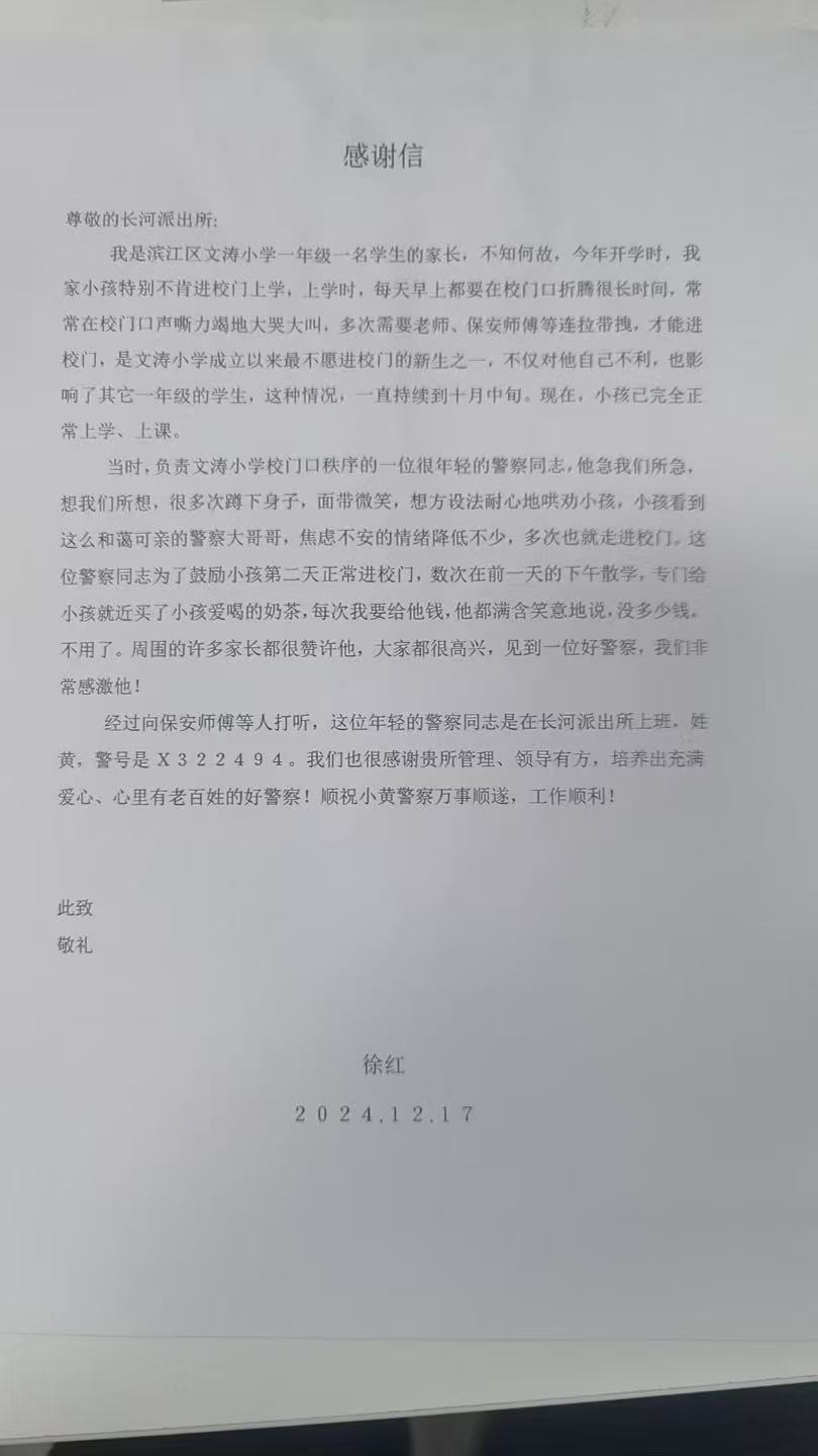 当时,负责文涛小学校门口秩序的一位很年轻的警察同志,他急我们所急,想我们所想,很多次蹲下身子,面带微笑,想方设法耐心地哄劝小孩,小孩看到这么和蔼可亲的警察大哥哥,焦虑不安的情绪降低不少,多次也就走进校门。这位警察同志为了鼓励小孩第二天正常进校门,数次在前一天的下午放学,专门给小孩就近买了小孩爱喝的奶茶,每次我要给他钱,他都满含笑意地说,没多少钱不用了。周围的许多家长都很赞许他,大家都很高兴,见到一位好警察,我们非常感激他!
