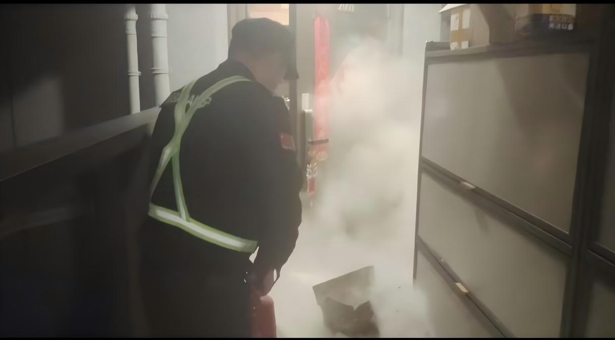 10:35晚班领班王永军、袁飞龙和巡逻岗窦可武组成3人应急小组到达现场发现是走廊堆积的杂物着火,因乱丢烟头引起,领班和巡逻岗敲门和业主沟通并使用灭火器扑灭明火,排查火场隐患。