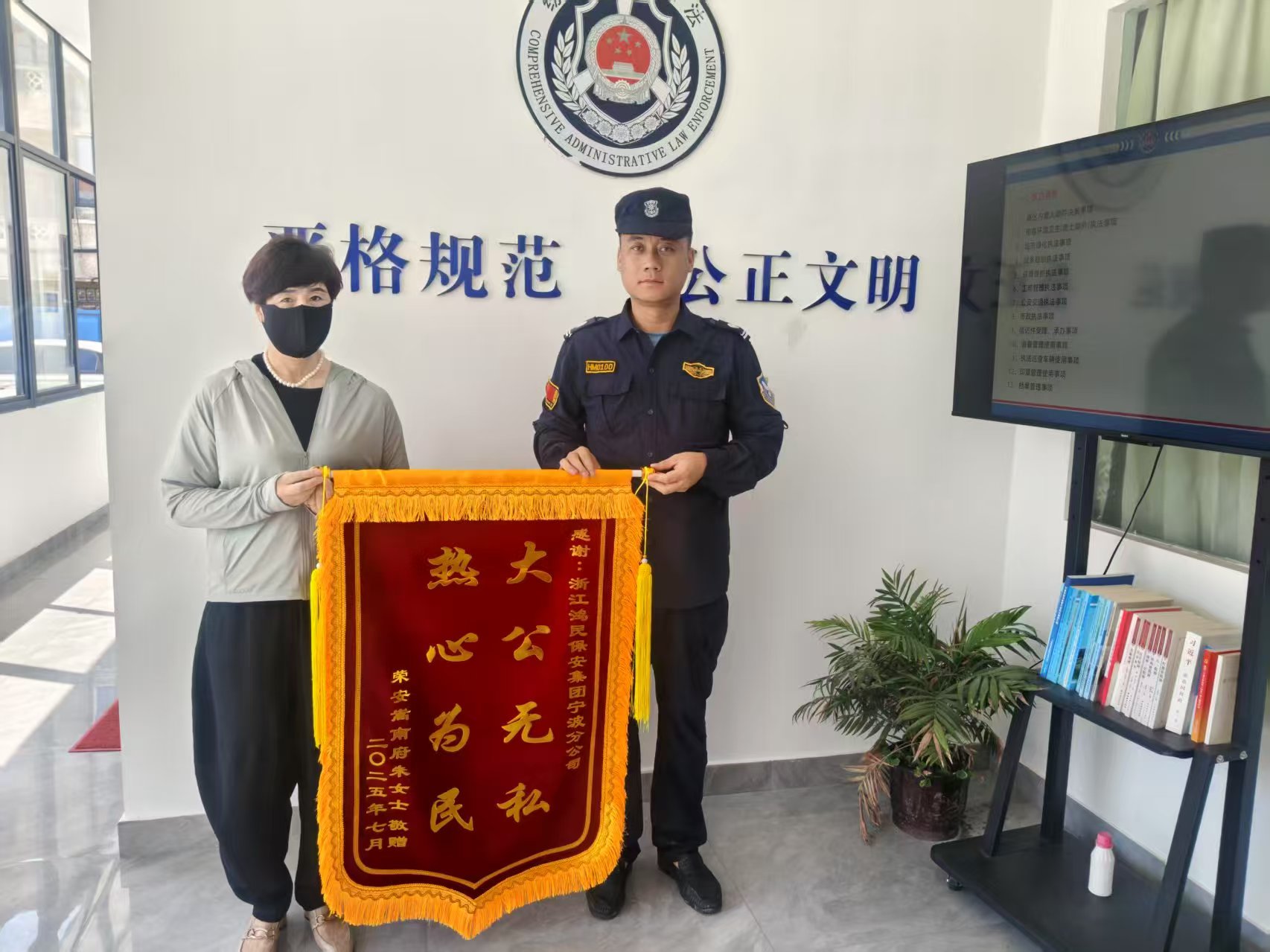 7月1日上午9点左右,浙江鸿民保安服务集团驻宁波咸祥城管中队序化队员兰宁同志,在咸祥菜市场日常巡逻当中,在菜场出口附近捡到钱包一个,包内有多张银行卡和会员卡。队员兰宁心想这位失主一定很焦急,凭着高尚的思想品德,一如既往地秉承鸿民保安想人之所想的工作作风和急人之所急的服务操守,他顶着烈日,在原地等待30分钟仍不见失主。随即他上报中队,并将钱包放到了咸祥派出所,后经派出所工作人员的共同努力下,10点半左右终于将失物物归原主。失主朱女士在拿到遗失的钱包时对帮助他的工作人员再三感谢,表示包里钱虽然不多,但里面的证件比较多,补办起来非常麻烦。7月4日,朱女士送来“大公无私,热心为民”的锦旗,对浙江鸿民保安服务集团驻宁波咸祥城管中队序化队员兰宁表示感谢。