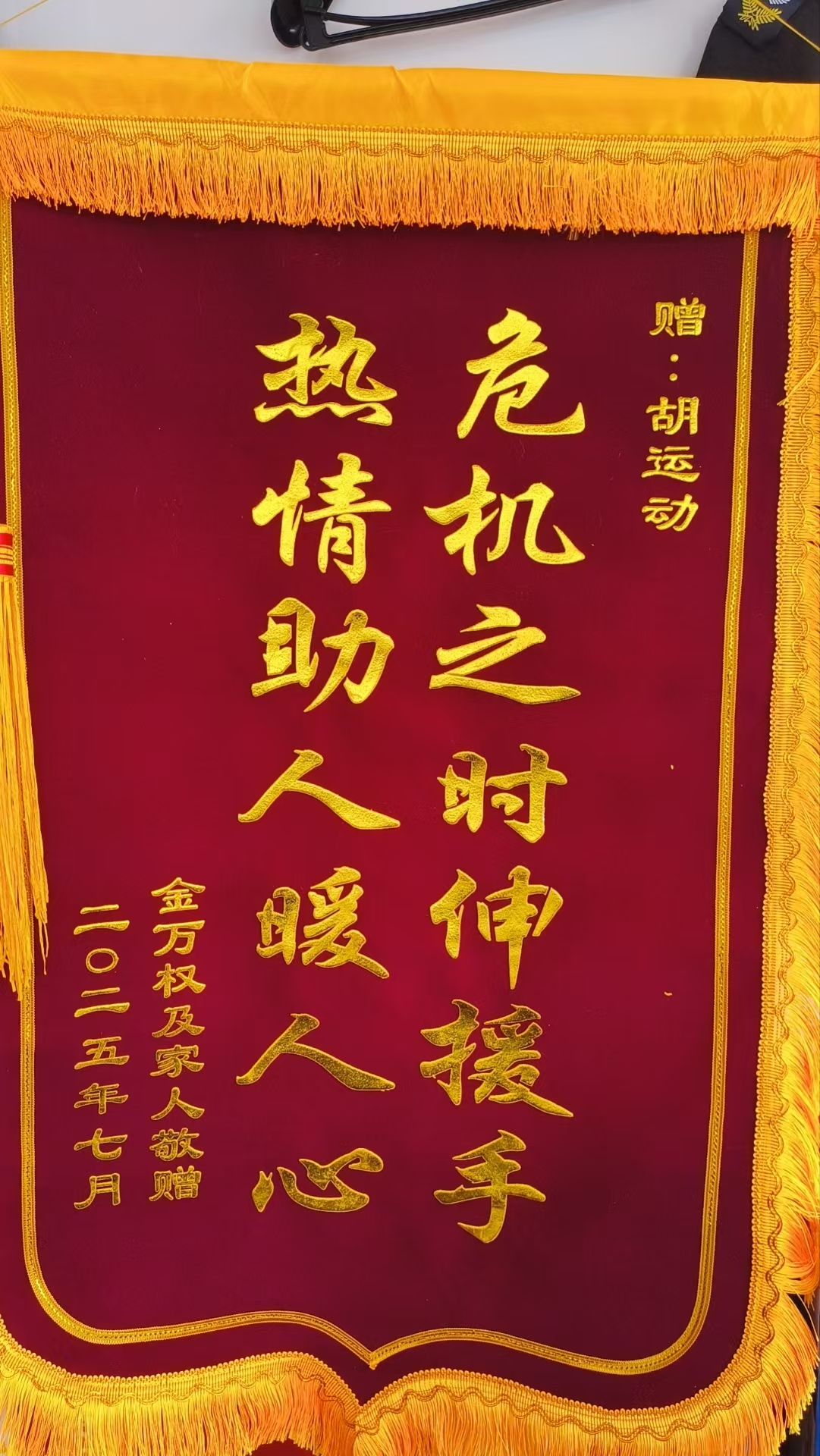 远在东北老家的伤者家属得知了胡运动的善举后,被他的行为深深打动。2025年7月20日收到他们特意寄来的锦旗,上面写着“危机之时伸援手,热情助人暖人心”。这简短的话语,是对胡运动最高的赞誉。