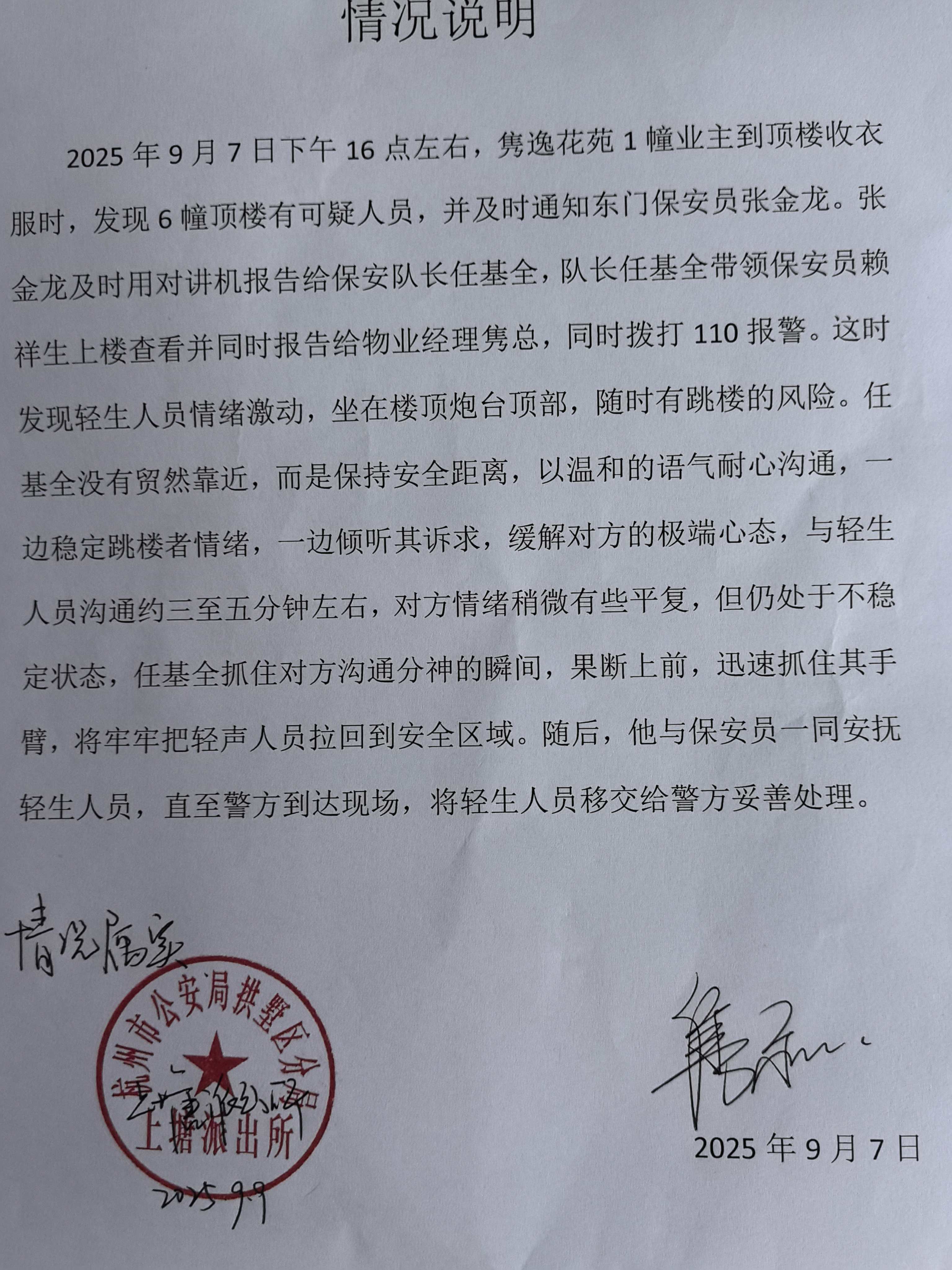 2025 年 9 月 7 日下午 16 点左右,隽逸花苑 1 幢业主到顶楼收衣服时,发现 6 幢顶楼有可疑人员,第一时间通知了东门保安员张金龙。张金龙接到通知后,迅速用对讲机报告给保安队长任基全。