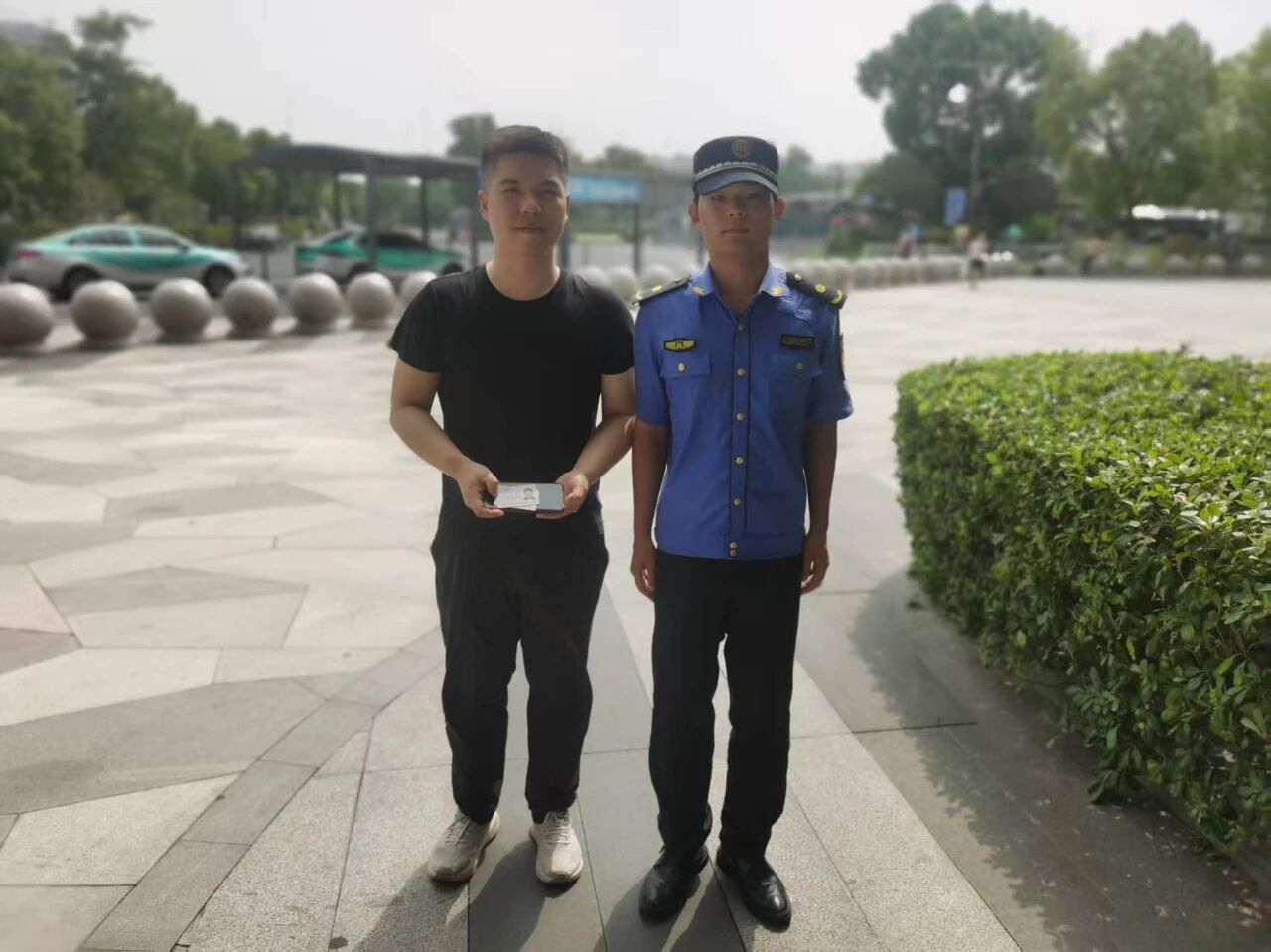 9月30日10:20,浙江超晟公司驻杭州市临平区新城市容项目员工原付凯在临平南站北广场巡查时,捡到一部华为手机、一张身份证和一张社保卡。因一时无法联系到失主,原付凯便将情况报告了项目负责人,并按要求在原地边巡查边等待。