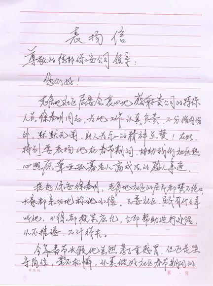 2018年3月5日,公司收到一封来自老房地社区居委会的表扬信,表扬保安徐春明在春节期间,协助社区热心照顾聋哑孤寡老人高成法的感人事迹。