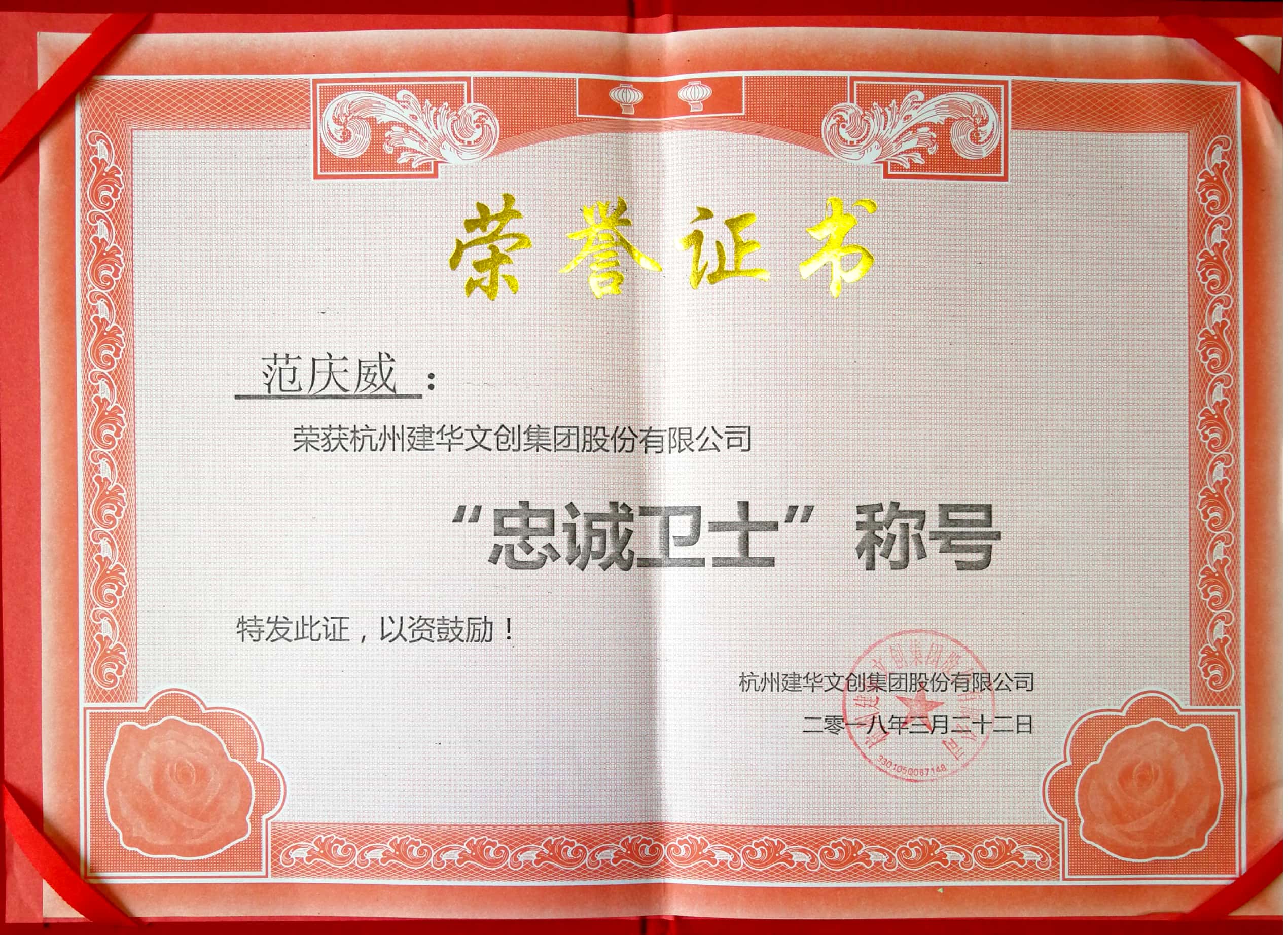 杭州拱墅保安服务公司驻杭州建华文创集团股份有限公司保安员范庆威同志,在“317”消防栓内压力表爆管事件中,不顾个人安危,用手死死堵住缺口,并及时上报属地工程部,最大程度地降低了园区及业主的损失。拱墅保安认真负责的工作态度获得了服务单位领导的高度评价与肯定,范庆威同志更是被杭州建华文创集团股份有限公司授予“忠诚卫士”称号并颁发了证书和奖励。