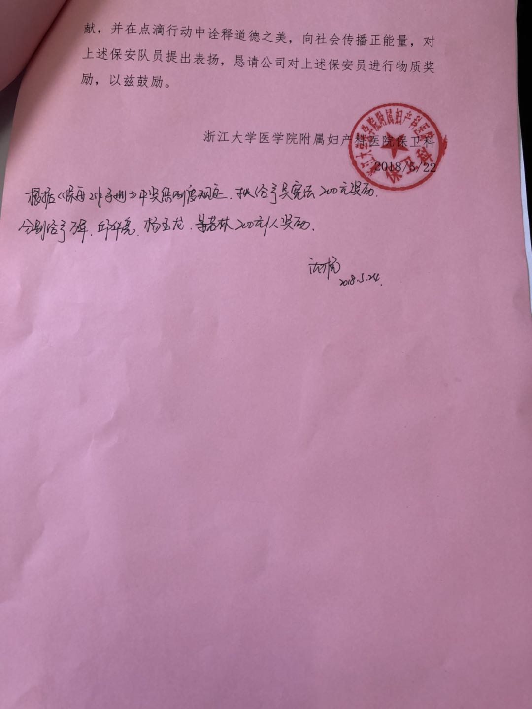 2018年5月22日上午,暖心的一幕在浙江大学医学院附属妇产科医院上演,一名孕妇突发疾病在医院三号楼大厅自动扶梯上晕倒,我司队员万军立即赶到孕妇身边查看情况,发现其已失去意识,万军立即通知消控中心,并维持现场秩序,疏散人群;保安队长邱华亮接到报告后带领队员杨玉龙、姜若林推着平车赶到现场,几人合力将晕倒孕妇台上平车送往急诊室,因送医及时该孕妇已无大碍。