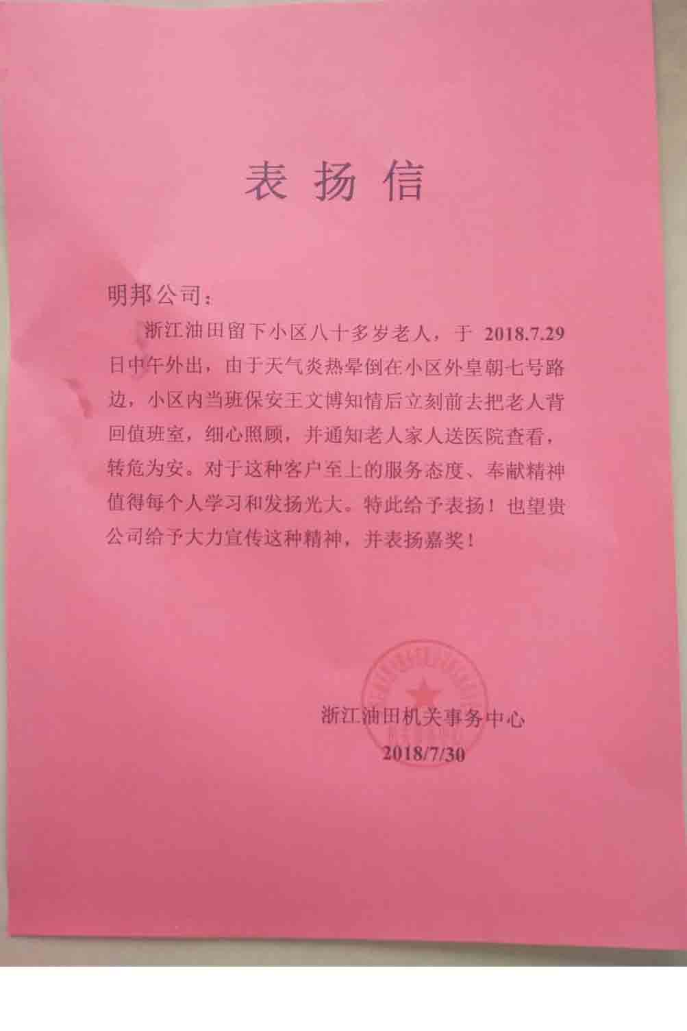 2018年7月29日浙江油田小区业主82岁的老人赵素芹外出时因天气炎热晕倒在地,我明邦公司当班保安员王文博知情后立即前去把老人背回传达室,细心照顾并通知老人家属,在此期间老人因身体不适吐了一地,王文博同志不嫌脏不嫌累立即对值班室进行了清扫。因为他的热心及时的救助,让老人的身体很快恢复健康,王文博的高尚行为明邦保安公司树立了良好榜样、这种客户至上的服务态度值得每个人学习,公司高层领导及甲方公司对王文博同志均给予了表彰与奖励。愿这种奉献精神继续发扬光大。