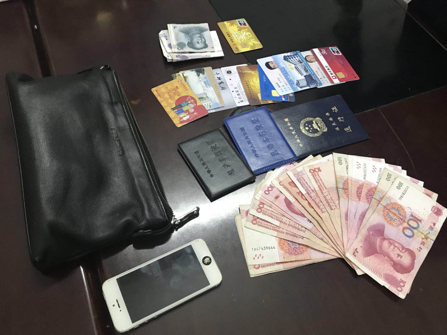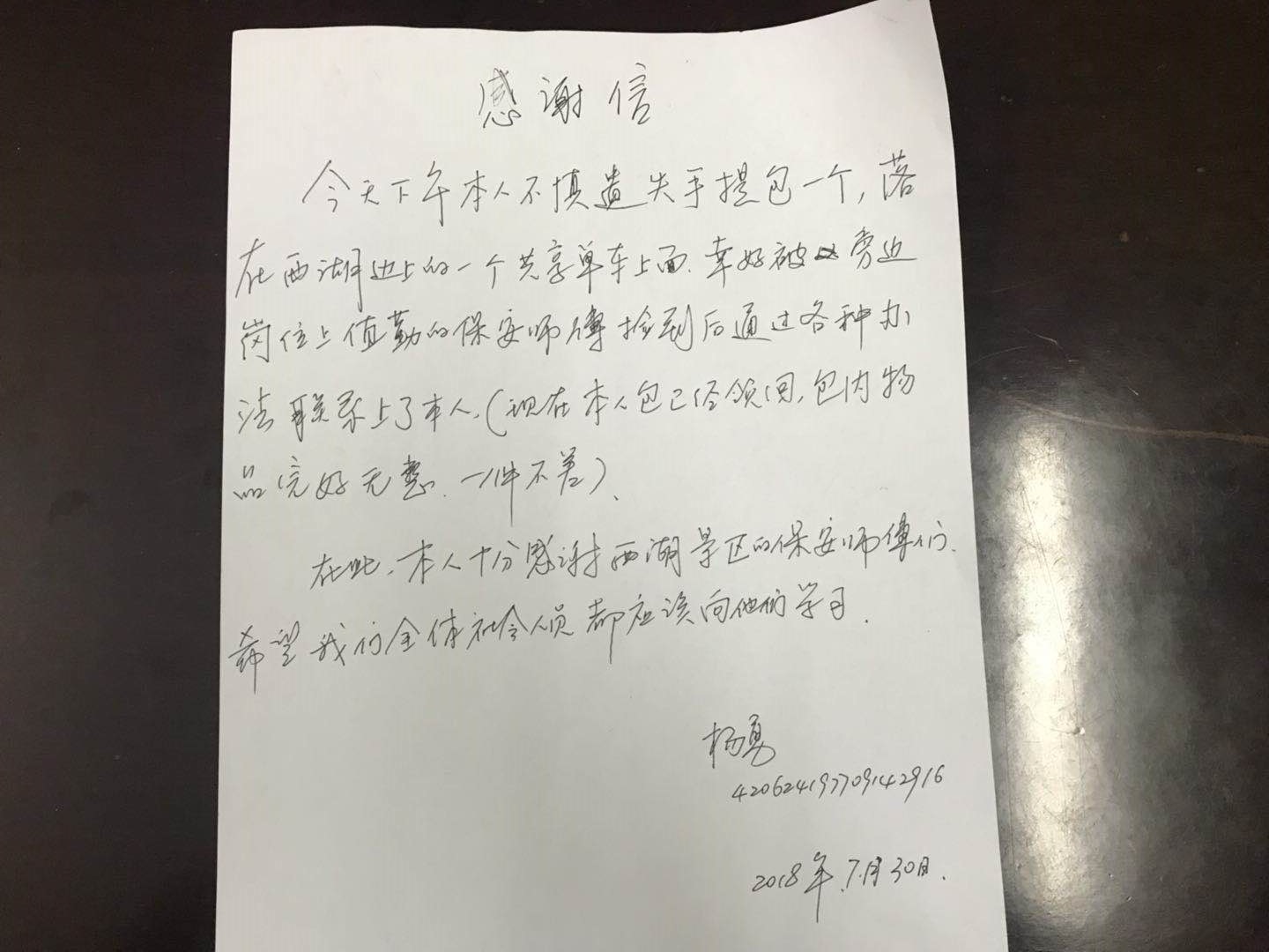 湖滨保安员葛广在工作巡查时,发现共享单车上有一个皮甲(人民币2000余,银行卡数张、港澳通行证一本、手机一部)并联系了当地的行政执法队员,并通知失主归还。失主表示感谢特地写一份感谢信表示感谢湖滨保安员葛广。