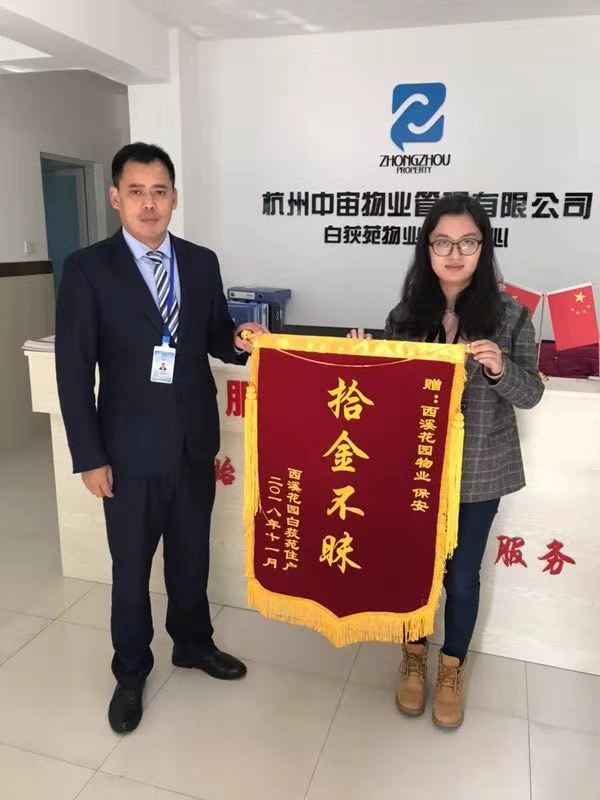 第二日,物业通过派出所协助联系上了失主,并交还失主。业主为表谢意送来锦旗。在此,公司特别表扬班长沈顺荣平时工作认真负责,始终把维护小区及业主的安全放在第一位,很好地践行了力邦保安公司的服务宗旨。