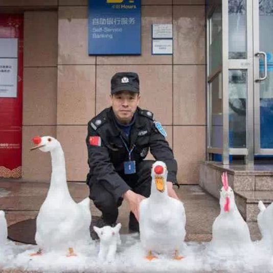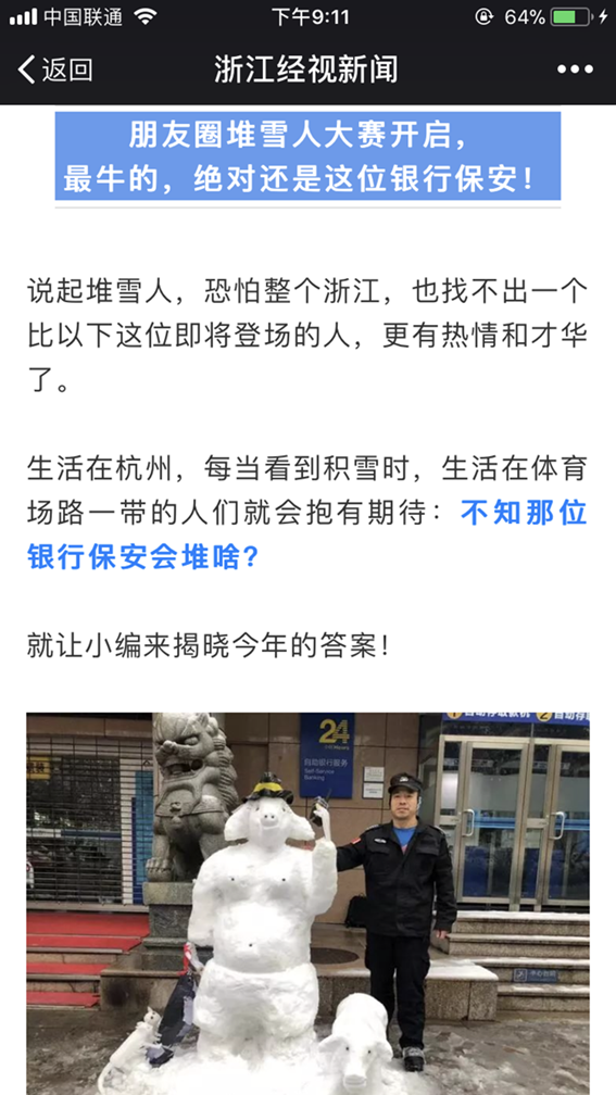 2018年12月10日早上,浙江经视新闻记者7时30分许路过体育场路与中河北路交叉口的建设银行时,就看到这位名叫杜金钱的保安大叔的“首秀”已经完成,一位银行职员正忙着给他拍照。大家看到了吗?是《西游记》里的猪八戒,旁边还有一只可爱的小猪。看来,是为了即将到来的猪年,讨个好的彩头。