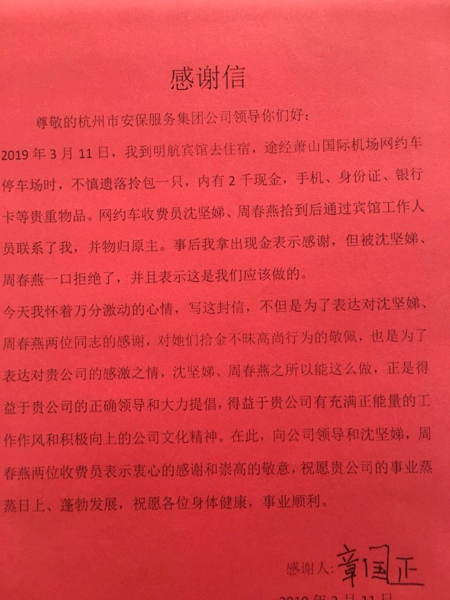 三月春风暖人心,雷锋精神永传承。2019年3月11日,公司驻萧山机场网约车停车场收费员沈坚娣、周春燕在执勤时发现一个拎包无人认领,内有现金2000元、手机、身份证、银行卡等贵重物品。通过多方查找,两名女同志通过明航宾馆工作人员联系到了失主,并物归原主。事后,失主将一封感谢信送至了公司,将印有“风格高尚,雷锋精神”的锦旗送到两名女同志手上,表达自己的感谢之情。一面锦旗、一封感谢信,字里行间展现了公司两名女保安高尚的个人品质和精神风貌,这既是一种肯定,也是一种鼓舞。
