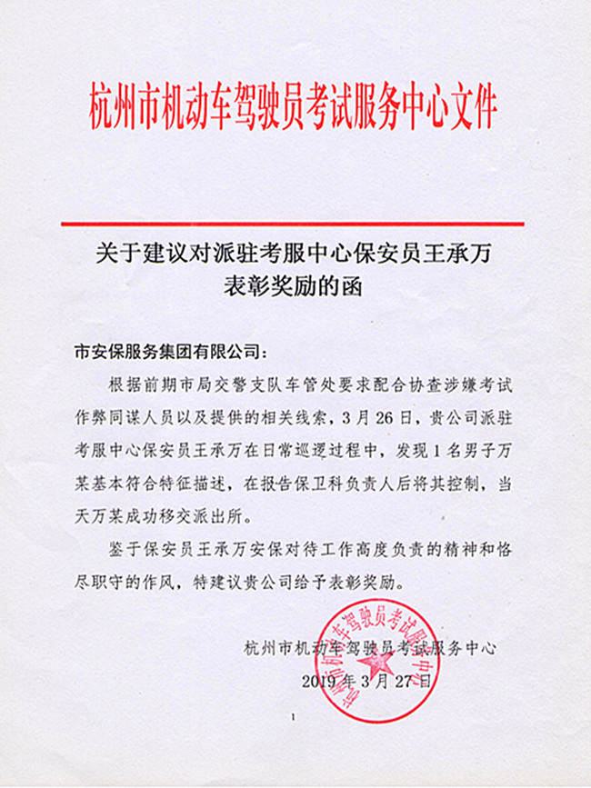 杭州市机动车驾驶员考试服务中心特地向公司发来了建议表彰奖励函,肯定了王承万高度负责的精神和恪尽职守的作风,让我们向王承万同志学习。