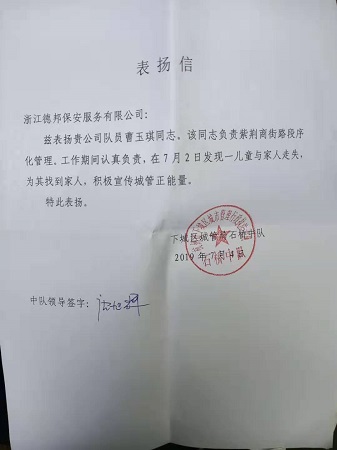 浙江德邦保安服务有限公司曹玉琪队员,负责紫荆商街路段序化管理工作。2019年7月2日上午8点40分,当他巡逻到此地时,发现了一个年约3岁的男童在路边哭泣,一边喊着“妈妈妈妈”。他立刻走上前去,抱起他,问发生了什么事情,但孩子还太小,话都说不太清楚,他只能一边安慰,一边沿路寻找他的家人。通过一个多小时的寻找,终于有人认出了小男孩就是他的邻居,带着他们一起回了家。在这段时间里,曹玉琪一直抱着小男孩,温柔的安慰着他。当他们回到家中,小男孩的妈妈抱着儿子当场就哭了,激动万分的表示感谢。