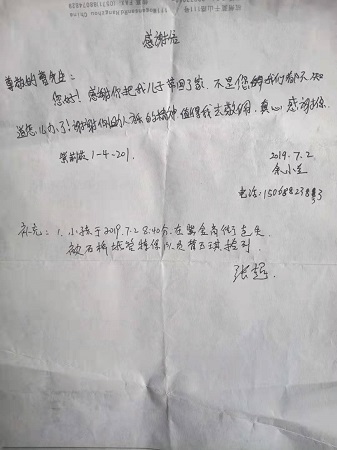 事后了解到,原来当时小男孩的奶奶带他出门买菜,刚好路边有人打架,就跑去看热闹,把孙子忘在路边。后来,小男孩的妈妈还送来了一封亲笔写的感谢信,朴实无华的话语却深深的表达了一个母亲最崇高的谢意。
