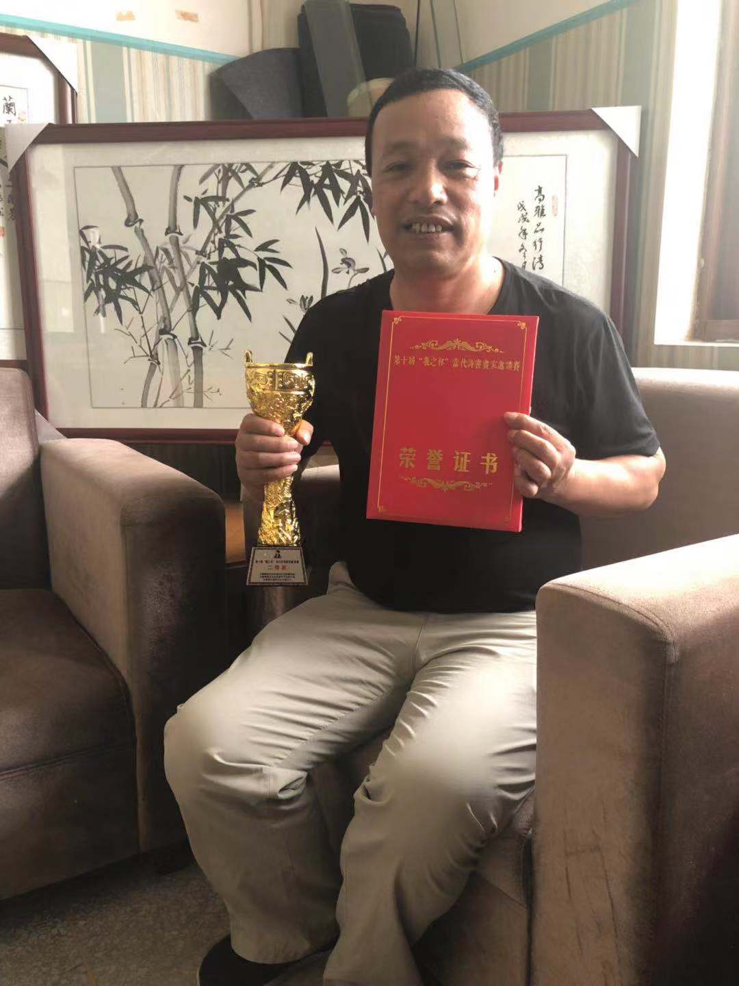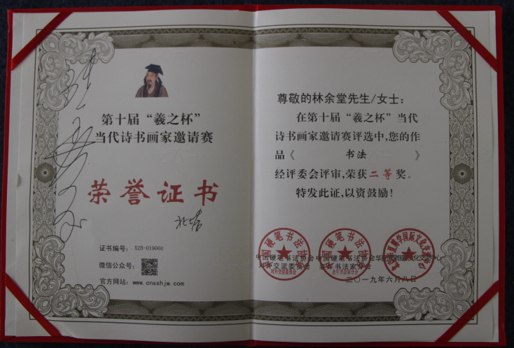 2019年6月8日上午,第十届“羲之杯”当代诗书画家邀请赛颁奖盛典在全国政协礼堂召开。中国人民解放军军事科学院原副政委、解放军中将冯永生、中国书法家协会中央国家机关分会顾问张虎、中国硬笔书法协会主席张华庆、中国硬笔书法协会党支部书记、驻会副主席兼秘书长李冰等领导、专家和来自全国各地的诗书画家出席了盛典。