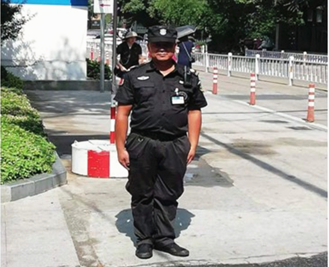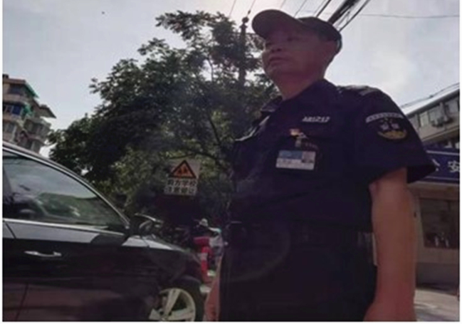 保安员刘秀福,安徽合肥人,党龄38年,已在同德医院工作8个年头,身为党员的他,坚持以身作则,坚守最艰苦的岗位,每天指挥近上千辆的车辆进出,确保了医院入口交通的安全与通畅,确保了医院有序的工作环境。“头顶太阳烤晒,脚踩地面热气蒸腾,没有一丝风,一站就是三个多小时,还要留心观察车辆、发现隐患排除,每次下岗,他的制服上都析出了一层厚厚的汗碱,衣服像纸板一样硬……”