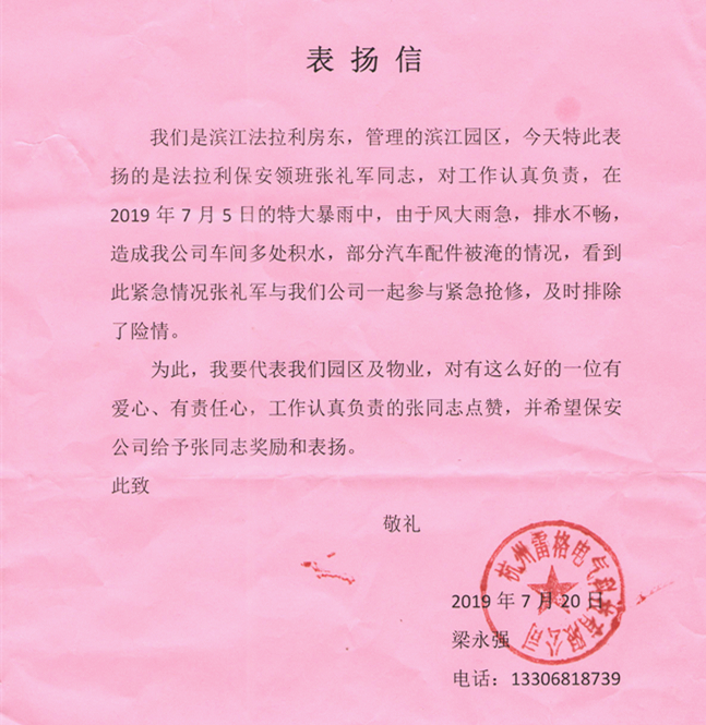 2019年7月5日,突降暴雨,由于短时风大雨急加上排水不畅,造成滨江法拉利4S店车间多处积水,部分汽车配件被淹,眼看水位还要进一步上升,公司驻滨江法拉利4S店保安员张礼军二话不说,带领队员迅速参与到抢修工作中去,他们不顾风大雨大,拿起工具赶到积水点进行疏通,并将汽车配件搬到安全区域,避免了客户单位巨额的经济损失。