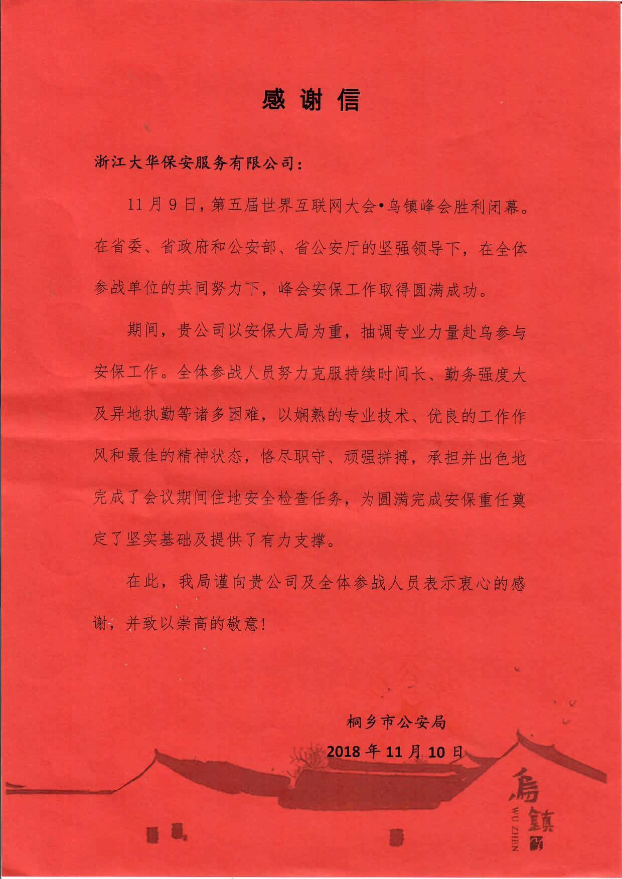 2018年11月,第五届世界互联网大会在乌镇举行。根据大会安保总指挥部提出的要求,公司派出230多名精挑细选的骨干队伍参加了此次安保安检任务,共投入大华自主研发的“追猎者”智能安检设备30余套,主要负责乌镇景区外围卡口、嘉宾驻地酒店及峰会核心点互联网之光的安检任务,全力配合现场公安、武警人员做好治安防控工作。周学杰作为安检业务负责人参加此次安保安检任务,率领团队累计查检进场8万多人次,查检包物4万余件,查检车辆近5千台,查检邮件2万余件,发现禁限带品近千件。公司顺利圆满的完成了第五届世界互联网大会的安保安检任务,做到了零失误,得到了大会安保总指挥部的高度认可,受到了嘉兴市及桐乡市公安部门的表扬。