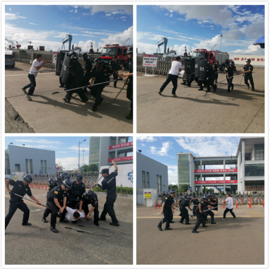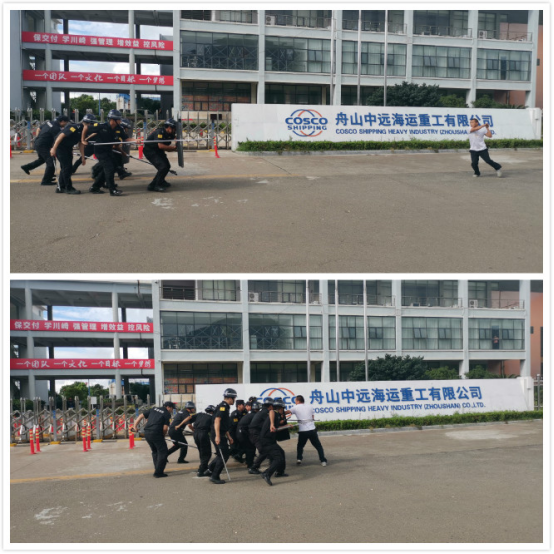 上午九点,演练正式开始,一名工作人员模拟“暴徒”持铁棍闯入舟山中远重工海运,试图行凶,情况十分危急。当值保安人员第一时间进行报警和通知公司领导。针对现场情况,杭州英盾驻中远船务其余保安人员快速武装,携带手持警棍、防爆盾牌、防爆钢叉等器械,并且相互协同配合,规范使用器械,成功将一名 “暴徒”进行控制,并移交给警方进行处置。演练中,按照演练预案,认真部署好演练的各个环节和内容,结合实际设置假想状况,细化应急处置工作流程和每个岗位的职责任务,各司其职、紧密协同、配合默契、处置果断,圆满完成了此次反恐演练。