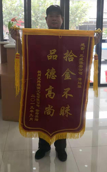 我公司驻浙江农商银行商业城支行商惠分理处上班的保安员黄灿强,在2019年7月2下午下班搞卫生时,在大堂角落发现一只皮夹,里面有银行卡5张,居住证一本。保安员立即汇报与银行相关负责人,查看监控后联系失主,并当面归还失主,失主表示重金酬谢,被保安员谢绝。 后失主念念不忘此事,送来一面锦旗向保安员黄灿强表达感谢之情。黄灿强坚守拾金不昧,这种崇高社会责任感与道德风尚精神成为我们学习的好榜样!