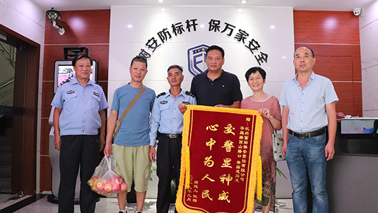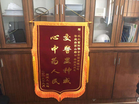 2019年9月11日早上,杭州富阳保安服务有限责任公司的大厅内来了几位老百姓,找到了我们公司的柴小熊常务副总与王晓明直属保安部副主任两位领导,并送上了一张“交警显神威,心中为人民”字样的锦旗。多次评价了我们保安公司对下属员工在岗前及岗中的培训工作到位及恪尽职守的感谢,给予我们公司领导工作肯定。